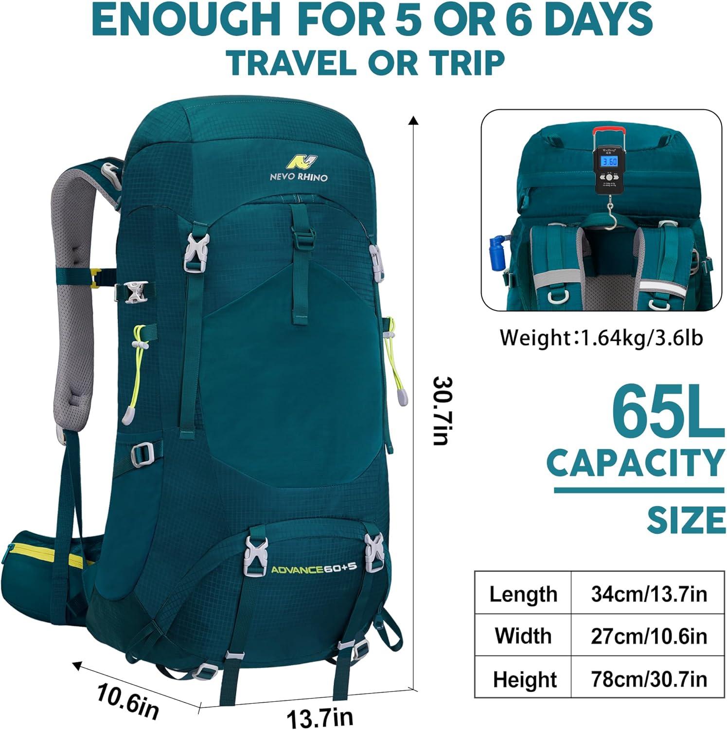 N NEVO RHINO Internal Frame Hiking Backpack 50/60/65/70/80L, Mountain Climbing Camping Backpack Daypack Waterproof Rain Cover(09 Green)